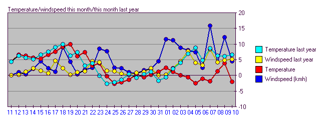 Höchstes Windmittel = 33.3 kmh aus 203°(SSW) tag 09 zeit 11:20